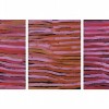 With the introduction of the lineal forms of body designs and scarification marks, she takes a new direction in her work. As a young woman embarking upon her ritual education, she learnt about awelye designs while painting on the bodies of women about to take part in a ceremony. Awelye refers to the ceremonial world of women, or women's business, and includes women's ceremonial body designs. The striped design painted on the breasts and neckline of ceremonial dancers seems to be the inspirational starting point for many of Kngwarreye's paintings. She had used lines before and then gradually submerged them under skeins of dots. Now she presented the art world with simple, bold compositions of parallel lines in strong dark colours. Body Paint 1993 is a masterwork of strength and simplicity, reflecting the journey of the line in her work. Horizontal, parallel, thin, thick, dark, light, smooth, jagged all relating back to simple ritual designs painted on the body.