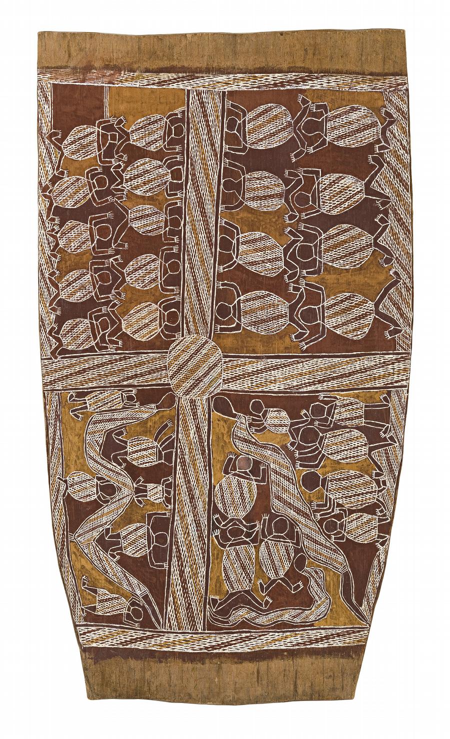The original accompanying label reads: 'In the time of myths, an old man sat under a tree on Melville Island. A Yam leaf drifted toward him and he decided to follow it. He paddled his canoe for many days and nights until he came to the Island of Ghosts (thought to be Elcho Island) where he found the Morning Star (Banambirr) hidden in a basket. An old woman guarded the basket, letting the star out of the basket each morning on a long string. The man persuaded her to let it fly out as far as Melville Island. The man returned home, but that same night his back broke and he died and he returned to the Island of Ghosts'.