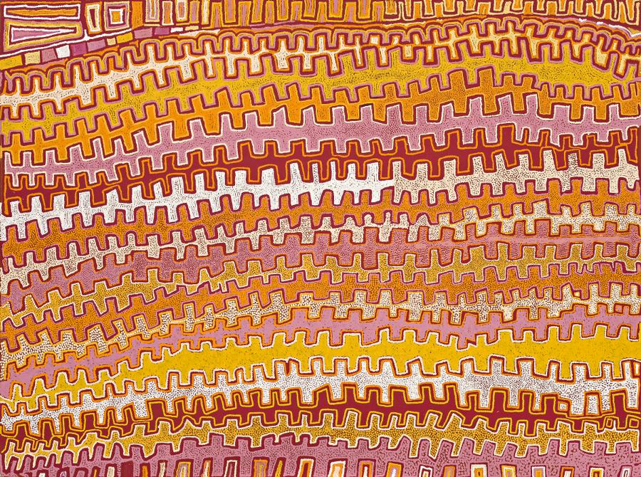 Tjungurrayi regularly paints his country around Yalangerri and the setting for this painting is the lake at Ngarru, west of Jupiter Well in the Gibson Desert, where a large group of mythical ancestral Tingari Men camped on their journey east to Tarkul and on to Wilkinkarra (Lake Mackay). The designs in the painting relate to those used in rituals associated with the Tingari where the law is revealed to initiates. The painting evokes the spiritual nature of the landscape, endowed by the life-sustaining powers of the ancestors.