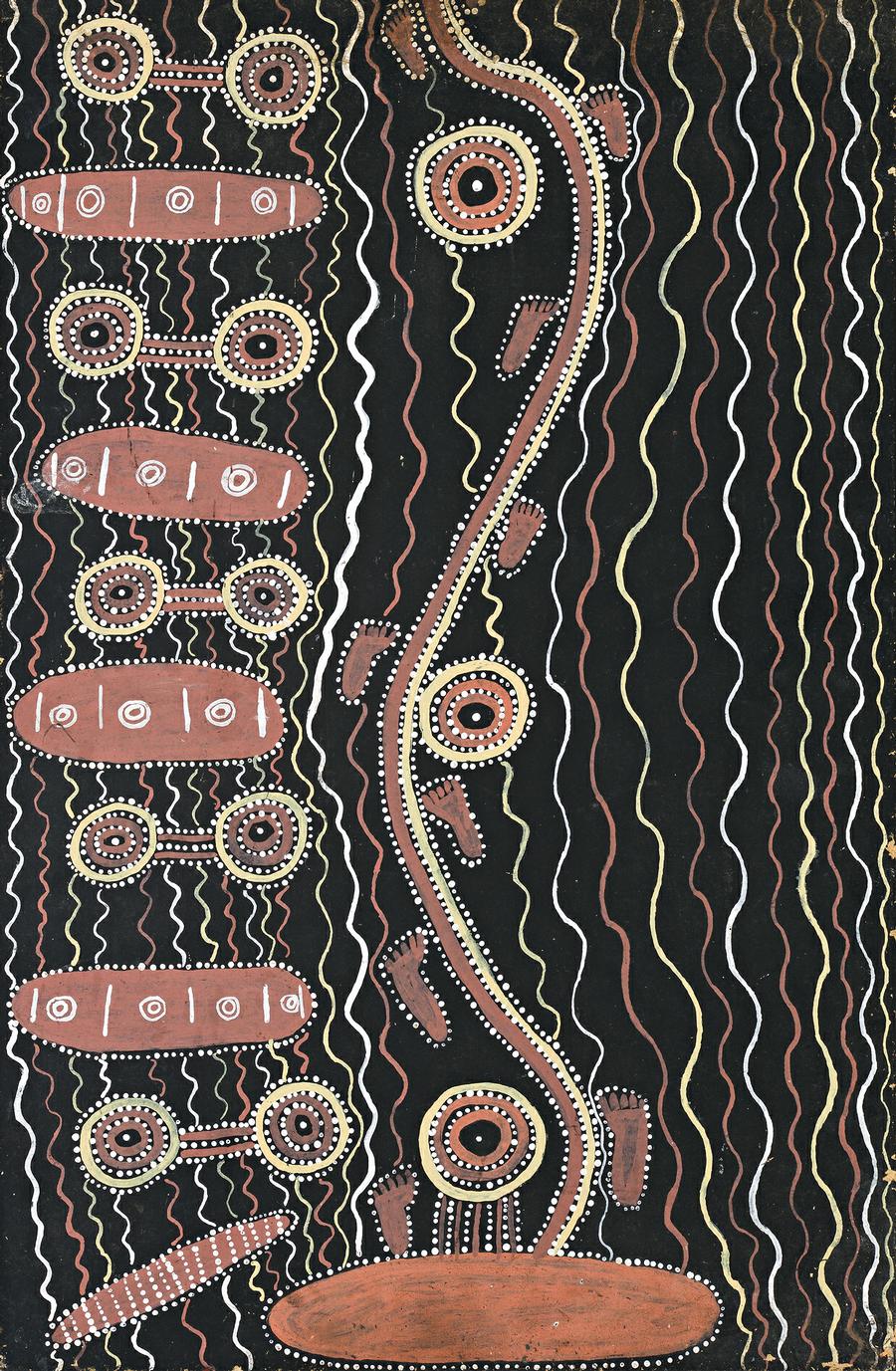 Anthropologist Fred Myers who worked extensively with Pintupi artists has recorded this myth and notes that the Old Man was powerful and dangerous, one'who carried dangerous sorcery objects in his headdress'.1 After having illicit sexual relations with his classificatory Mother in law which was forbidden, the Old Man moved on but his penis swelled up and he suffered painful torment. The pain increased as he moved west until his testicles fell off or went walk about.