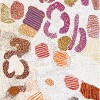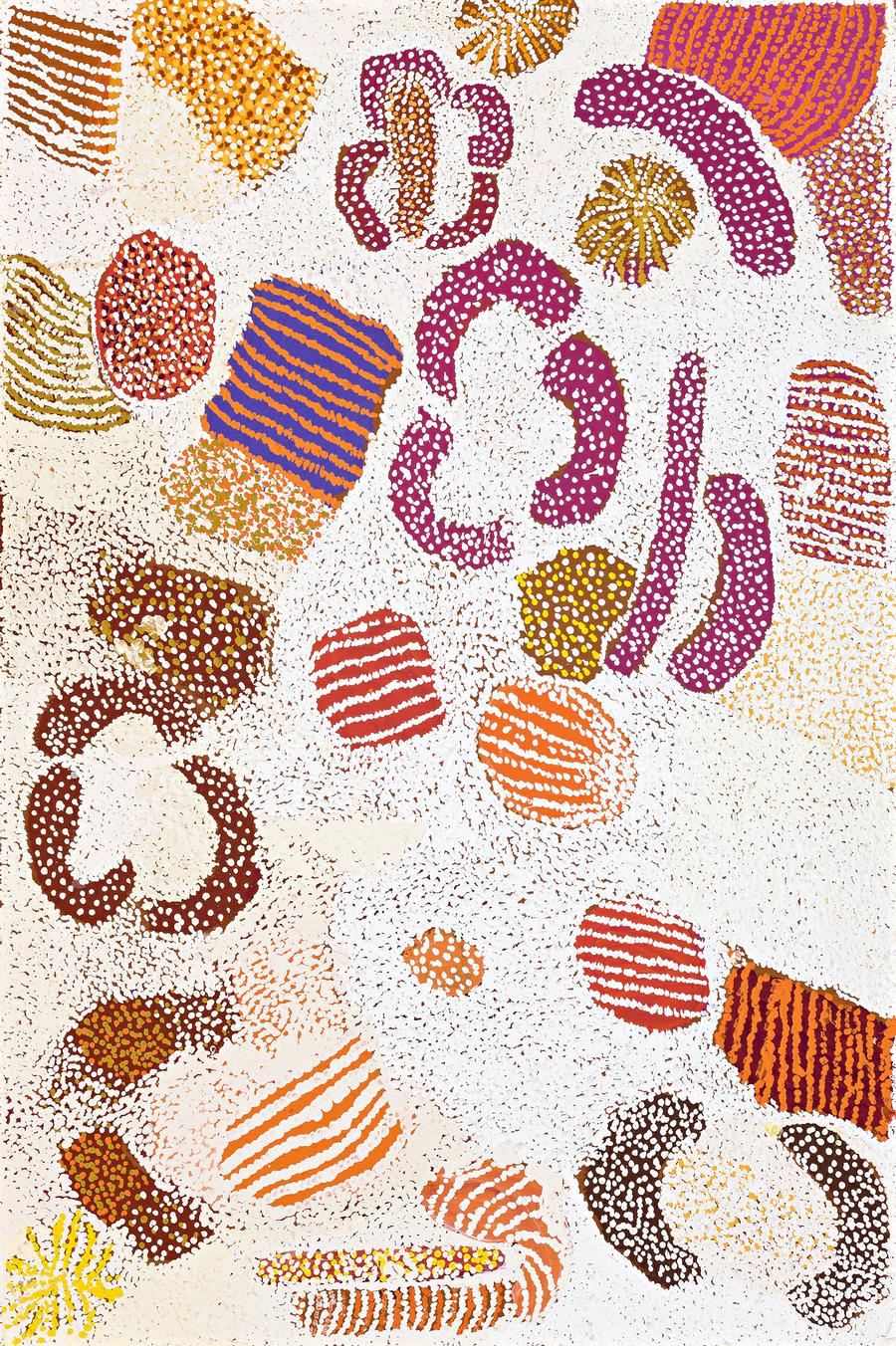 In this work Nyumi addresses Parwalla, the country of her childhood. Contrasting with the conventional Balgo Hills palette of blistering reds and pinks, Nyumi's creamy pastels interspersed with jewel-like forms speak of an individual aesthetic and sensual engagement with place. Parwalla depicts the abundance of Nyumi's country, the painting dense with luminous symbols representing bush foods such as Kantjilyi (bush raisin), pura (bush tomato), and minyili (seed). Women are shown as U shapes, with their wana (digging sticks) and coolamons. The many dominating white layers are referred to as kinti-kinti (close-close) which creates a rich texture that references the seeds of spinifex which grow abundantly after the rains. In 2004, a number of Nyumi's works were included in the Biennale of Sydney, On Reason and Emotion. Within the catalogue which accompanied the Biennale, Hetti Perkins described Nyumi's paintings as expressing 'more than a nostalgic yearning for the past. The arrangement of formal elements in her works articulates the physical connection of desert dwellers to their country'.1