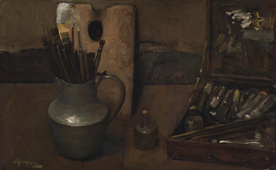 Ramsay was renowned for his expertise in still life, one having been accepted at the New Salon.2 Tenderly portraying his tools of trade, this work was one of several done in his Paris studio when painting experimentally, in between classes and having to flatter sitters. He often included a still life in his portraits, where they take on a significant role.3