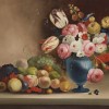Still Life with Flowers and Fruit is a classic example of the art of the Tasmanian colonial artist William Buelow Gould. All are European in origin, chosen for their beauty of form and colour, the whole painting having a richly decorative appeal similar to that of the designs on fine English nineteenth century porcelain, redolent of genteel life. The elegance and peace of Gould's art, however, could not be further from the troubled life he led. The artist was a gambler, a drunkard, and a thief. The contrast is so great that it seems unbridgeable, yet the tormented life of the creator gives his painted images a certain poignant appeal, of an ideal beauty given birth in a world of emotional strife and turmoil. It is said that many of his Van Diemen's Land works were exchanged with innkeepers for drink.