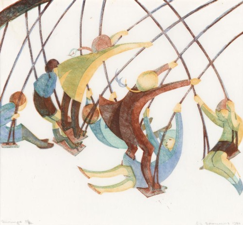 Swings 1932 belongs to an outstanding group of rhythmic modernist designs by Spowers featuring children playing, including The Giant Stride 1932, Fox and Geese 1933, Tug of War 1933 and Children's Hoops 1936.