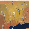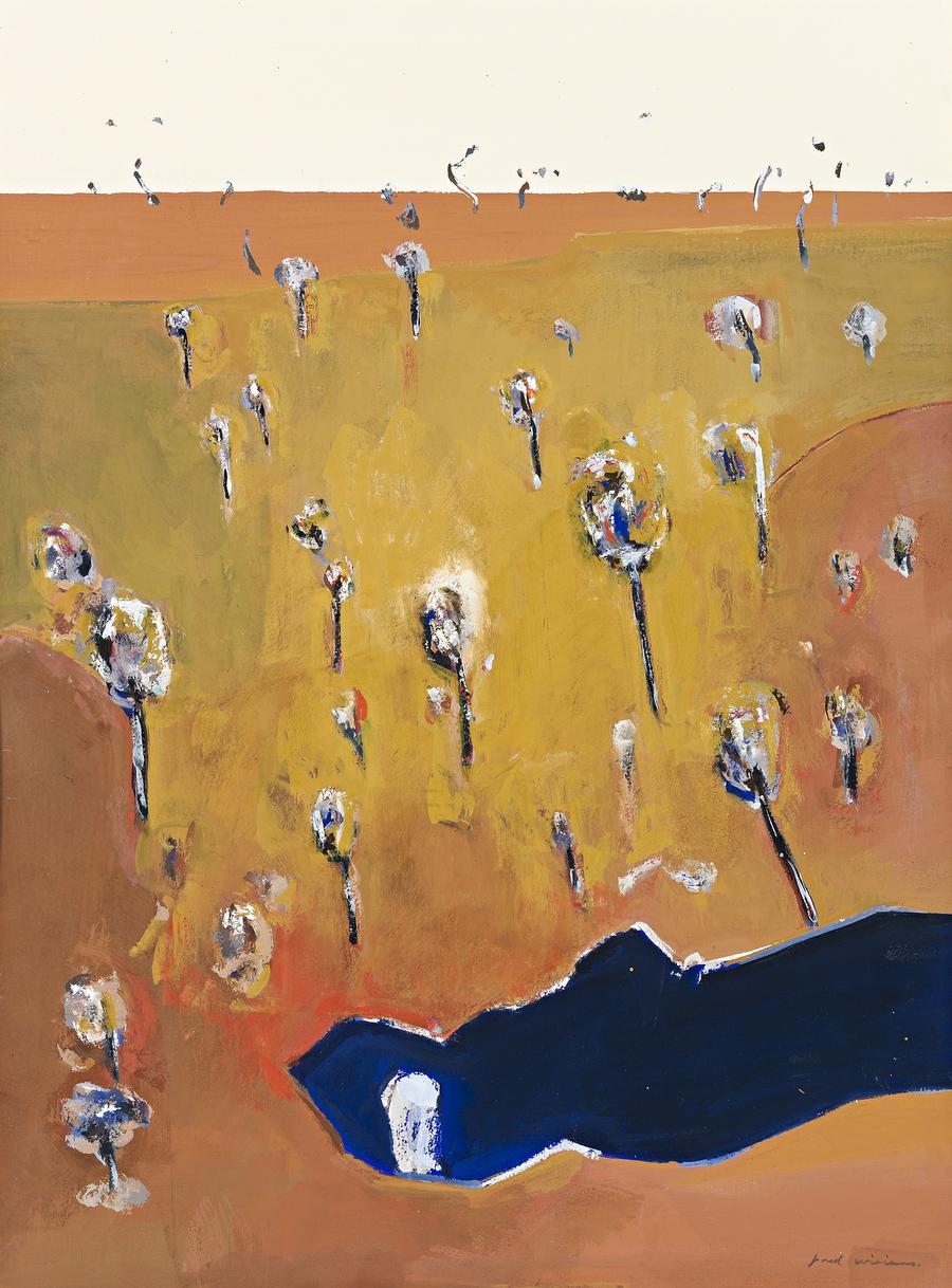 The mid-sixties were a particularly fruitful time in Williams's art, of increased variety allied to an increasing abstraction. This is seen in our gouache, Waterpond in a Landscape 1966.While based on the water pond at Lysterfield in country Victoria, the absence of the artifice of Western perspective allows greater freedom of invention in the play between breadth and intimacy in the landscape. It transcends mere verisimilitude; yet is redolent of the sun-baked Australian landscape. In a captivating fusion of reality and abstraction, bold areas of colour and detailed features conjure up the fascination of a non-figurative work while remaining distinctly Australian in imagery and atmosphere. Gum trees sport across fields of ochre, and surfaces are enlivened by the texture of the paint and colour contrasts, intruded upon by the dark depths of the pond. Irregularity of contours adds further lively interest. In 1966 James Gleeson wrote, 'Williams has made the wooded hills and plains of Victoria his special province, and so persuasive are his images that we cannot look at the real thing except in the terms he has set down for us in paint.'2 This gouache and the others in the series are further testimony to the originality of his vision.