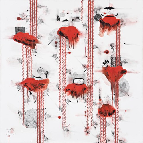 Pule returns to Christian motifs regularly and emerging behind the blood stains and peony roses we often find the Pietà, the most intimate Christian symbol concerned with loss, suffering, anguish, grief and ultimately the precursor to redemption and renewal. In In Preparation for that Promise this symbol appears almost as a stencil reminding us of its repetition and diminishing it, as though it is only but one of so many instances in history of profound loss and injustice. Colonisation, migration, in fact all conflicts bring forth their own grieving and blood letting. Indeed the most obvious element in this series of works by Pule is the dense blood red clouds dripping and seeping through the white canvas. A constant in his work, these 'clouds' are rich in metaphor. Some have interpreted them as islands or pools, not clouds at all. While overtones of violence and death are accentuated, a sense of fecundity and growth is also present. As always in Pule's work the clouds and the events unfolding below them are linked and entwined by the trailing ti mata alea or Cordyline vines and flowers and sometimes peony roses. According to Niuean mythology the first people of Nieu originated from the Cordyline tree so in some respects these paintings are part of the larger creation mythologies of the Pacific and beyond.