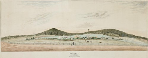 Noted as a portrait painter, there are a number of the Martin family of New Norfolk, of William Lee at Cressy, and those in the Sorrell area near Forcett dating from the 1850s.It was also the age of portraits of properties, of mansions and homesteads, the new settlers anxious to record the progress they were making in the Antipodes - for their own delectation or to send home to admiring relatives. Conrad Martens was busy in this genre in New South Wales, and later in Victoria, Thomas Clark and Eugène von Guerard painted many memorable canvases. Costantini's domestic landscapes, by comparison, are quite rare. The property of Mr James Jonathon Rollings (1819 - 1878) in our watercolour was located at Forcett, north east of Hobart, named 'Rosy Vanyan' after his property in Cornwall, England. Like his contemporaries, Rollings was a prosperous landholder, his property supporting wheat, sheep, cows, and fifteen children with his wife Martha Wiggins (1824 - 1894). Costantini's watercolour celebrates fruitfulness, the homestead nestled contentedly between the bosoms of anthropomorphically shaped hills. In the foreground Rollings and his dog admire his achievements, gazed upon by contented cows, all meticulously delineated and detailed with pride. A whimsical blend of naivety and humour gives this historical work its added attraction.