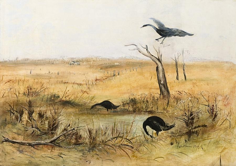 Arthur Boyd's Wimmera paintings are at their heart Pastorals in the great European tradition of rural landscape painting. Like John Constable over a century earlier, Boyd painted from nature and found a deep romanticism in provincial farming life that gave his works an air of renew a land optimism even among the grass tussocks and dry fields of northwest Victoria in the 1950s. As Barry Pearce comments about the artist, 'he has always been a traditionalist'. 'Boyd stood in the river of European tradition, took from it what he needed, and proceeded to give back something of his own.'1 Wimmera Landscape with Black Swans painted between 1950 and 1952 takes as its subject the life giving waterhole and a group of black swans which appear to have migrated towards even the scarcest of water sources in an otherwise dry and parched countryside. In the distance, a lone cow grazes in a brown paddock alongside a lean-to farmhouse, or shed. Yet in the foreground three robust black swans provide one of the few signs of life in this sparse composition.