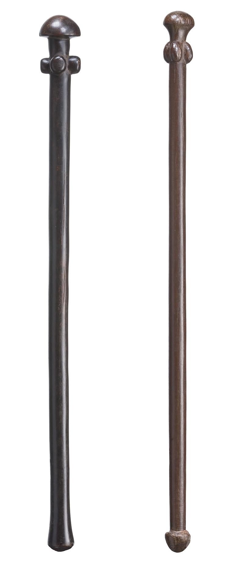 carved wood, each with four round bulbous protrusions below the mushroom-shaped head