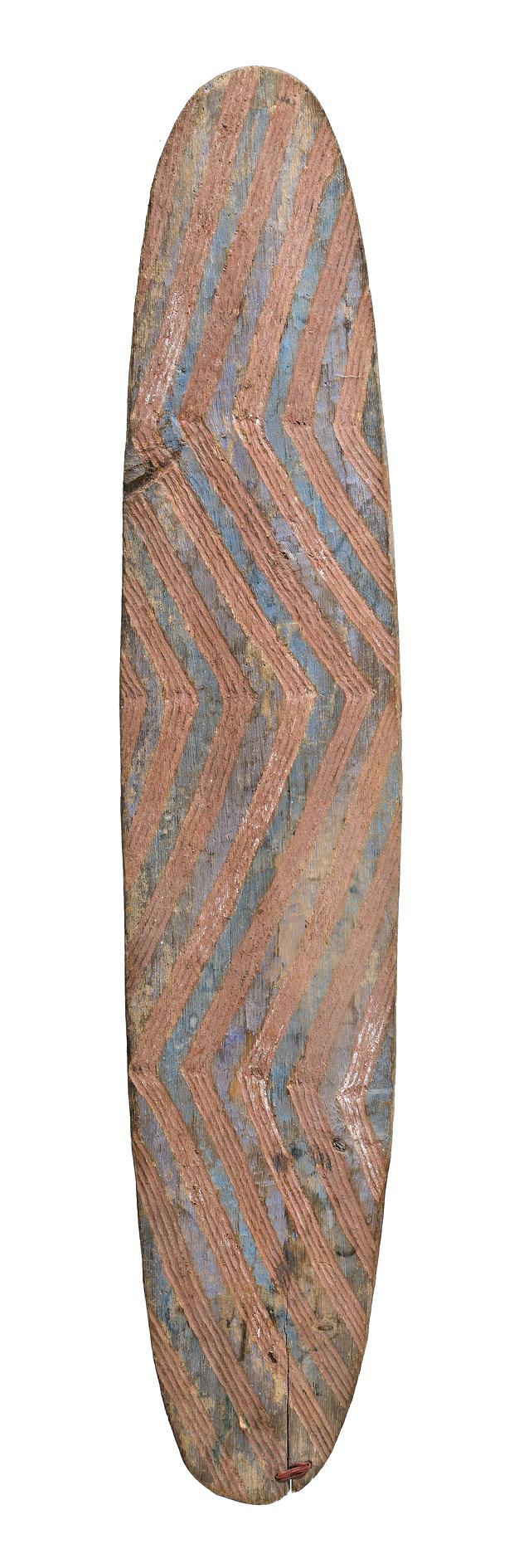 carved wood with incised zig-zag designs infilled with red and blue pigment