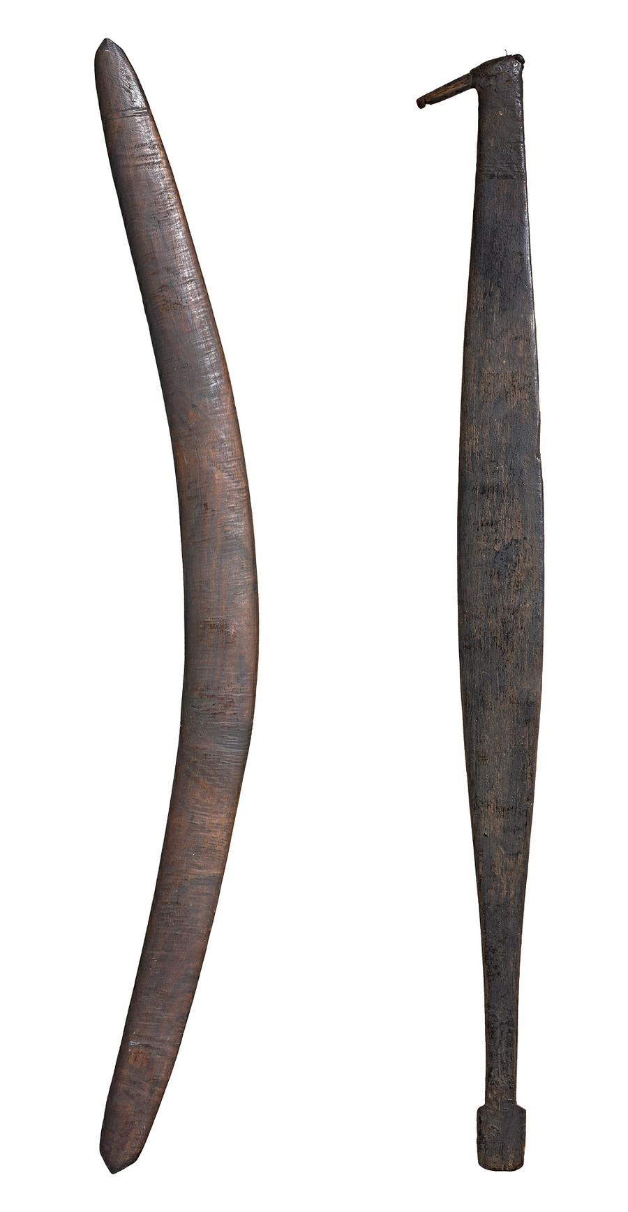the boomerang of carved wood of biconvex section, the spearthrower of carved wood, the wooden throwing peg hafted with twine and resin