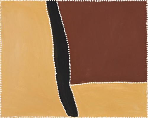 This painting is accompanied by a certificate of authenticity from Waringarri Aboriginal Arts which states: 'This painting goes with one of the verses of the Goorirr-goorirr (Guirr Guirr) coroboree dreamed by Rover when the mother of a man from Doon-Doon was killed in a car accident on the road near Turkey Creek. The woman who died belonged to the Worla tribe. The painting shows the road and country where she was killed. The song for the painting goes: kalimbiwarayi ngoodoo-ngoodoowayi, nyimba yilimbirri.'