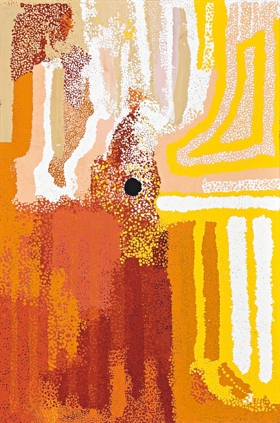 This work is accompanied by a certificate of authenticity from Alcaston Gallery which states: 'Christine has painted some of her mother's country south of Balgo, in the Great Sandy Desert. This country is named Winpurpurla after the tjurnnu (soakwater) depicted as the central circle in the painting. Winpurpurla is an inta, or “living water” place so it always has water. Women often travel to Winpurpurla to collect a variety of seeds including lukarrari which is ground to make damper and kumpupatja (bush tomato). The definite lines in the painting represent the tali (sandhills) that dominate this country.'