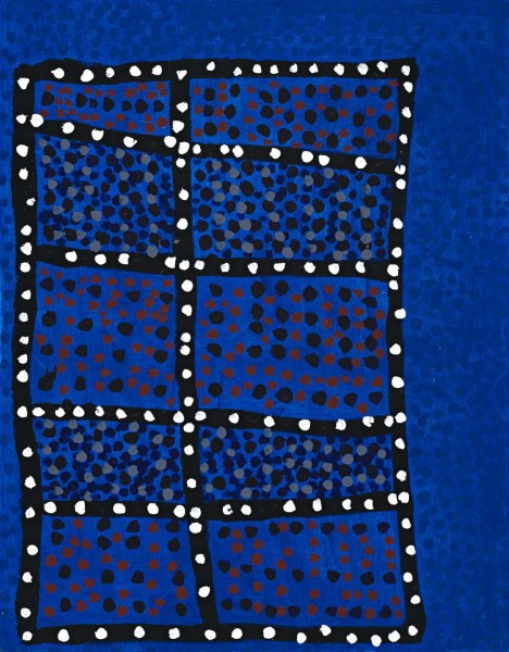 Body Marks of 2000 is one of the highly sought-after deep marine works Prince of Wales painted during this period. The dotting of the body marks in this particular example is more densely packed than usual and his use of bright white, ochre and black together create an intense energy. These are the markings Prince would have originally painted onto the bodies of his clansmen prior to a ceremonial dance but here they are transferred as a permanent record. The work was painted three years after his landmark solo exhibition of 1997 at Gallery Gabrielle Pizzi in Melbourne.
