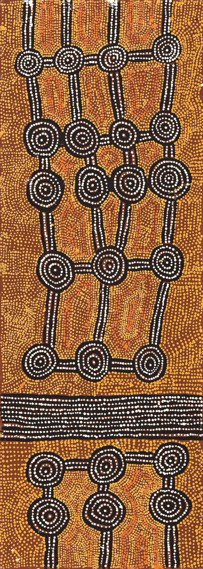 This work is accompanied by a certificate of authenticity from Papunya Tula Artists which states in part: 'The roundels in this painting represent the claypans at the site of Muyinga, slightly west of the Kintore Community. In mythological times a group of Tingari men camped at this site as they travelled towards the west, eventually passing through Ngurrapulangu, Umari and Wala Wala. The lines depict the tali (sandhills) that surround the sites.'