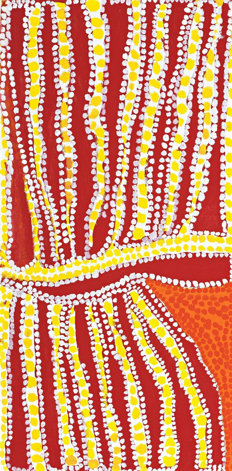 The artist states of this work: 'Jilji (sandhills) “This my brother's country. long time ago we walk around everywhere, them Jilji very big, big ones we walk through in that middle bit – Jilji not so big. Long time ago waljirri (dreamtime) people walking here everywhere. We bin living out here, make him camp out here when I was little.”'