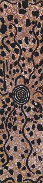 A copy of the Bellas Gallery exhibition catalogue states in part: 'The key mythological site in this depiction is Lunkata. The name given to this place refers to an old Blue Tongue Lizard man who came to this place in the creative era. ‘The country referred to lies to West North West of Alice Springs, in the vicinity of Lake Mackay. Here, in the beginnings of time, Lunkata travelled about; and the wavy lines with dots on either side represent his tracks, while the three U shapes indicate where he camped or “sat down”. However, the painting also illustrates the anthropomorphic nature of Lunkata, for while the tracks are those of the present day Blue Tongue Lizard, he is also perceived as a man – spear, woomera and boomerang are depicted between the lower two key elements of the painting, while his fire stick is represented by the straightline bar near the lower set of concentric circles.'