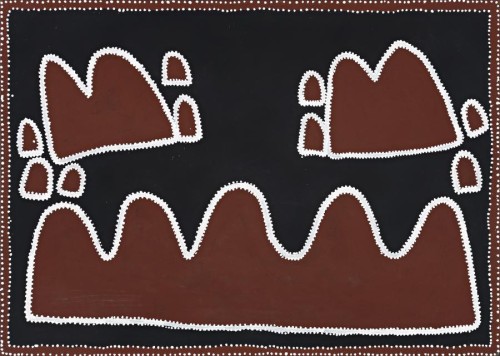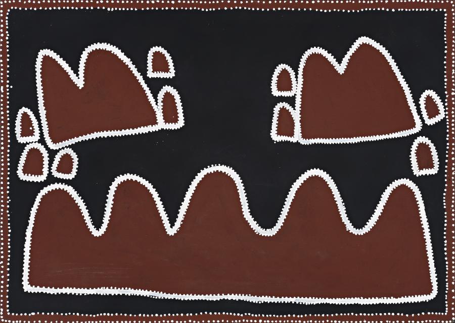This painting is accompanied by a certificate of authenticity from Red Rock Art which states: 'This work was created in June 1998 shortly after the death of Rover Thomas, the artist's life-long friend and artistic mentor. This painting shows a place on Texas Downs Station called Moonlight Gap where an “Out Camp” was established. While mustering this sector of the Station, Queenie was the camp cook and remembered being able to hear the men come in from mustering each evening. The sound of the horses would travel many kilometres down Moonlight Gap enabling Queenie at the camp to pre-empt the arrival of the men. Rover Thomas was one of the stockmen and in Queenie's words: “I could hear them coming long way and make'm fire, boil that water and give Rover a Naliga (tea) straightaway.” After Rover's passing Queenie executed a number of works that were inspired by her time with him...'