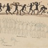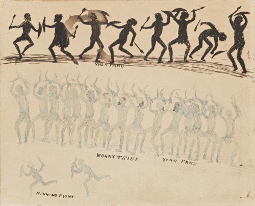 Murray Tribe Warfare follows a similar formal compositional arrangement to the artist's depictions of ceremonies. Two main rows of figures are drawn across the page from edge to edge, the top row with combatants engaged in the battle and the lower row with a group engaged in a war dance, pre-empting the fight. Boomerangs, shields and clubs are raised above the men's heads. Two figures engaged in a running fight are shown bottom left.