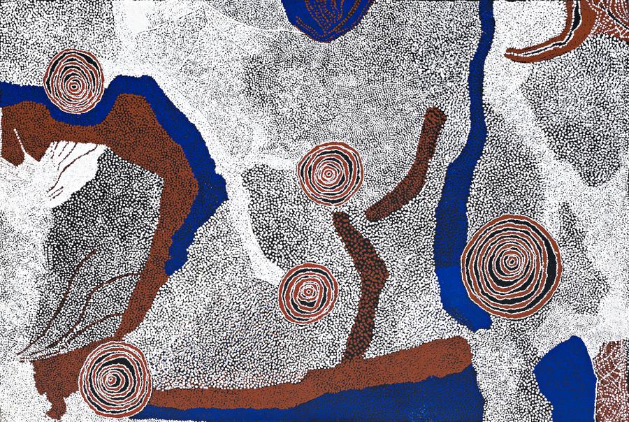 This painting deals with his central story of the rock holes near Pirupa Alka (rockholes near the Olgas and Uluru) and the journey as a young man to Areyonga and Haasts Bluff. However, it is unique for its highly restricted palette and the sheer scope of its depiction of Country. The predominance of white, in passages handled with a virtuosic delicacy evocative of filigree, and the subtlety of the shifting rhythms controlled on a monumental scale by the density and variety of dotting, together with the pungent use of blue, lend this work a shimmering radiance seen only in the best of the rare very large works he executed.