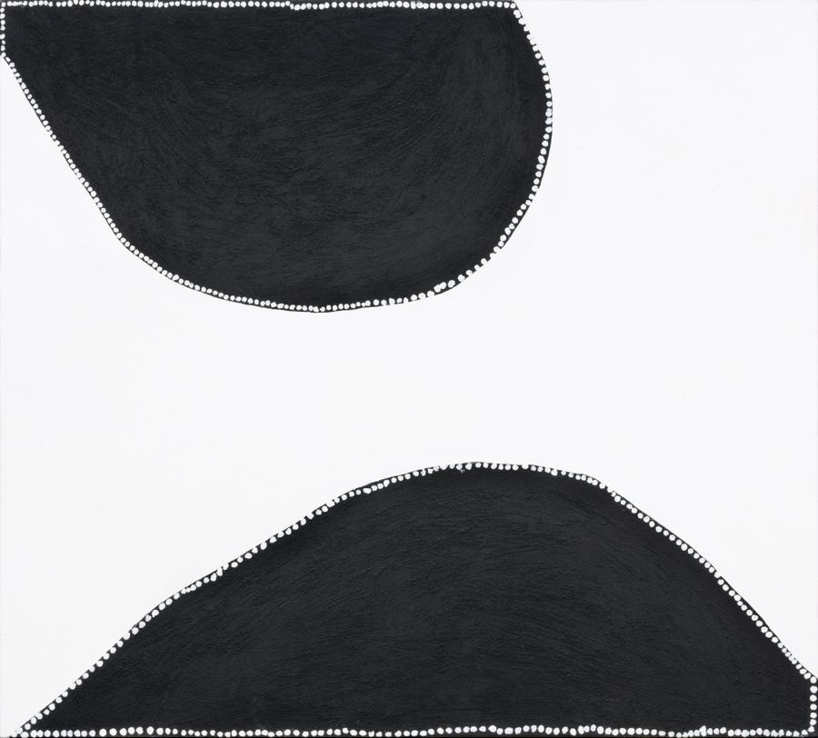 Thoowoonggoonarrin characterises Bedford's move away from the more familiar style of the earlier east Kimberley painters to create his own representations of country. His use of colour has evolved and the elimination of the ochre palette and introduction of a starkly contrasting black and white where the forms become dominant along with the interplay between the positive and negative space.