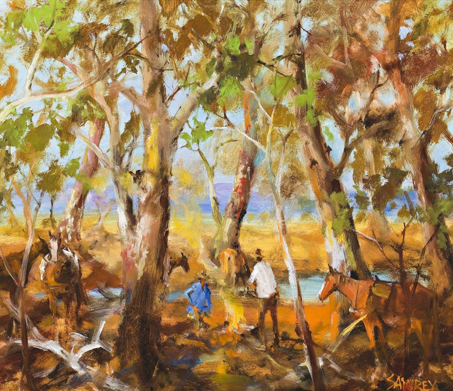 inscribed verso: “CATTLE BLOKES / ALONG THE / BARCOO RIVER” / W. QLD / HUGH SAWREY