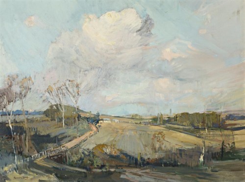 While the last two decades of the nineteenth century saw the establishment and development of a distinctly Australian school of painting, they were early times, with artists focusing largely on subjects of bush life and the endeavours of the pioneers. The growing popularity of this brand of nationalism did not embrace the elegance and sophistication of Long's art, although he was not without his admirers. His move to London in 1910 led to an involvement in etching, a medium in which he was particularly gifted. On his return to Australia and eventual residence, etchings gave way to paintings on pastoral themes. 'Many of these later paintings, painted with thick lush layers of oil paint, show the effect of light on water and the reflections of trees. Often these were painted at Narrabeen Lake where he owned a caravan and a strip of land.'1 While our painting eludes exact dating, it belongs to these later years when his decided talent as a landscape painter resulted in him winning two Wynne Prizes - the 1938 prize for Approaching Storm and that of 1940 with The Lake, Narrabeen. One of the particularly attractive features about the painting on offer is the way in which the breadth of handling captures the bold sweep of the view and grandeur of the sky. Rich in textural and atmospheric effects, vestiges of poetic allure linger nostalgically from another era.
