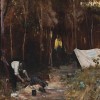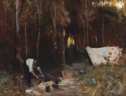 Streeton's Settler's Camp was painted at Box Hill. He, like Roberts and McCubbin, readily identified himself with the early pioneers in their life around the campfire, allied to being pioneers themselves in the creation of an Australian school of art. Set in remnants of the virgin bush, the camp was on part of David Houston's property. Roberts, McCubbin, and Louis Abrahams camped there first in 1885, captured in Roberts's The Artists' Camp, 1886, in the collection of the National Gallery of Victoria. McCubbin is seated while a hatted Abrahams grills chops at the end of the day's work. The close-up view pointedly adds to the intimacy of the figures with the bush. Abrahams painted a related watercolour Camp, Box Hill c1886 (private collection), showing the same tent and a figure, probably Roberts, at work out-of-doors on a large canvas propped, in the plein air method, against a tree.