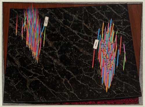 The greatest artists frequently take the simplest of everyday items from their environment and transform a basic implement into something deeply significant that reveals greater truths about the world. John Brack's 'Pencil series', often referred to as battles, are a great 'summing-up' of the world and humanity. In one instance this group of works painted between 1978 and 1986 are deeply introspective visions of the artist's own reclusive painting practices, focusing as they do on his immediate materials. More significantly, they are a meditation on social organisation and society's propensity to arrange itself along ideological, cultural, sexual, political or any other such lines into fortified groups or tribes. In the arrangement of his pencils and pens Brack transforms them into a metaphor of opposing forces. As Grishin points out in his essay on the 'Battle' paintings, 'Once a grouping has formed, then rivalry and opposition seem inevitable.'2 In U and I, Brack balances scrabble letters each of unequal value, amidst the advance guard of the pencils and pens instilling the work with an unequivocal sense of combat and division. The power and tension in this painting resides in the fact that the pens and pencils seem so tightly formed as though on the cusp of an assault.