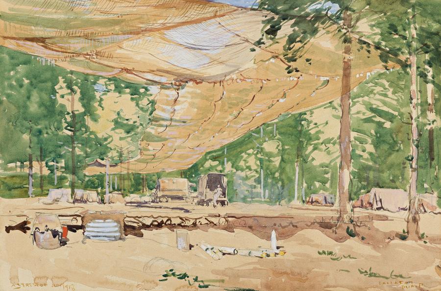 Royal British Colonial Society of Artists, Dominions and States Exhibition, 1918, cat. 8 as 'Camouflaged Road and Dump' (label attached verso)