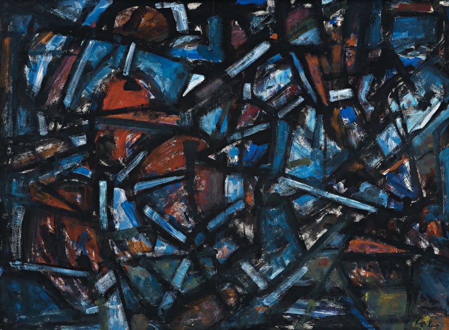 Roger Kemp's Experience was painted during the mid-sixties as his work was moving towards new heights through the breadth and freedom of his technique. The orchestration of rich reds and blues bounded by blacks, as in stained glass windows, is full of restless energy. Nevertheless, the ceaseless motion of the imagery is held in the paradox of contemplation, of stillness glowing with light. It is as if the universe's infinity of movement, explored in vibrant, colourful imagery, has been frozen in a flicker of time. It brings to mind lines from William Blake's Auguries of Innocence: