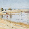 During the three years that teenager Arthur Boyd lived with his grandfather, Arthur Merric Boyd senior, at Rosebud on the Mornington Peninsula, he painted a number of landscapes, beach scenes, and portraits that revealed a talent both precocious and individual. An easy naturalism combined with an expressionist verve of execution, his paintings were often carried out almost entirely with palette knife, resulting in layers of thick paint, richly tactile in their visual and emotional appeal. Boyd later said, 'I liked the idea of how the purity of the colours was retained and also how they had an energy. The paint didn't get muddy and was easier to handle. ... I liked the clarity and brightness.'1 In his landscapes, the chief interest was atmosphere, as in the two 1937 paintings Rosebud Landscape with Grazing Sheep, and the brooding Dark Landscape with Stormy Sky, both in the collection of the NationalGallery of Australia, Canberra. Figures on Foreshore at Low Tide c1938, which belongs to this select Rosebud group, is likewise an engaging essay in atmosphere, entirely different in mood. Moreover, our painting on offer and related works such as Jetty at Rosebud 1938 and Early Morning, Rosebud 1938 (both in private collections2) follow in the footsteps of the Australian Impressionist painters. Tom Roberts, Frederick McCubbin, Arthur Streeton, and especially Charles Conder all delighted in painting the bayside beaches of Melbourne from Brighton, Black Rock and Mentone to Beaumaris. While Boyd later was to pay homage to Conder in his painting Autumn Afternoon, Mentone 1956-57, his Rosebud paintings are entirely individual works, following in a tradition but personal in interpretation.