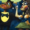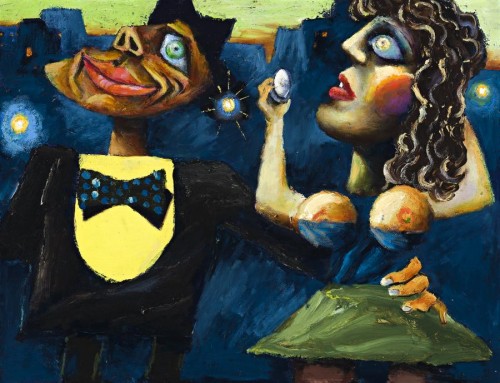 Albert Tucker is unrivalled for the power and impact of his imagery - individual, savage, at times demonical, always unforgettable. Flirtation 1954 is a classic example, belonging to that highly productive year, 1954, which saw the creation of other masterly works such as Killing, Encounter, and Duel, all in the collection of the Heide Museum of Modern Art, Melbourne, and Assassin in the Art Gallery of Western Australia, Perth, where blood flows from the screen into the very cinema itself. The early-to-mid-fifties was an important time for Tucker with solo exhibitions in Amsterdam, Paris, and Rome, as well appearing in the Venice Biennale of 1956. The following year saw his London exhibition which included Flirtation among other such riveting works as Apocalyptic Horse 1954 in the Art Gallery of New South Wales, Sydney, and Footballers 1955 of the National Gallery of Victoria, Melbourne. In 1957 Lunar Landscape was purchased by the Museum of Modern Art, New York, his first work to be in public collection.
