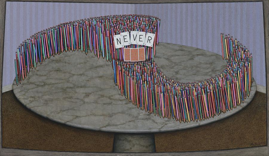By the late 1970s John Brack turned his vivisector gaze inward as he sought out new ways to express his endless fascination with mankind's social arrangements and interactions. He found a deceptively simple solution among the perfectly ordered pencils and ink pens in his studio and these tools of trade became a metaphor of conformism and society itself. When arranged in groups and viewed from the perspective of Brack's tightly formed compositions these bands of pencils and pens formed opposing armies marching to battle or on the cusp of conflict. As Ted Gott reiterates,'the 'pencil and pen' paintings and watercolours further reflect Brack's pondering upon humanity's perpetual disputes overterritory...'2 Never painted in 1989-90 also employs the device of vintage alphabet playing cards, which Brack would assemble with great dexterity into elaborate card houses in his studio. The army of pencils advancing from the rear of the marble table brandish the words of defiance, 'NEVER', while we are left to guess at the three letters held up by the opposing forces, the most obvious interpretation being the word 'NOW'. Brack has created an ambiguous standoff, the dramatic point before physical force will prevail and the dying moments where language alone may either stave off warfare or provoke it. As Helen Brack explains, Never is an all encompassing concept manifest in the entire battle paintings. In the case of this particular example,'It is NEVER give up; it is Continuation, that Humanity will continue - in whatever manner? On the back edge of the table, where those three leading pencils are leaving the NOW, there is a space, a sort of gateway against which the wallpaper stripes stream upwards, and the section that starts with the three cards and ends with the single pencil is a perfect half-circle.'3