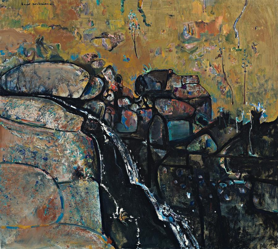 The paintings of Fred Williams's waterfall series are among his most romantic works, as well as being numbered among his best. Falls themselves are full of grandeur and daring, the drop of the waters contrasting with the immobility of the rocks as ramparts of time. They certainly fascinated Williams, whose interest was initiated by the nineteenth century romantic Eugene von Guerard's painting Waterfall at Strath Creek 1862 in the collection of the Art Gallery of New South Wales, Sydney. Williams made a free copy of it, the gouache now in the collection of the National Gallery of Australia, Canberra. Although painted in 1970, it was not until nine years later that he returned to the subject of waterfalls. In the early part of 1979 he journeyed throughout Victoria armed with a copy of Physiography of Victoria: An Introduction to Geomorphology by E. Sherbon Hills as his guide. He visited over ten sites including Agnes Falls near Port Welshpool, Trentham, the Kinglake National Park falls of Masons and Wombelano, and the Lal Lal Falls near Ballarat. He also painted the Stanley Park falls at Mount Macedon in central Victoria, as in the work on offer. Williams gave it the title 'Turritable Falls', not 'Stanley Falls' by which it is now known. This is probably explained by the source being the Turritable Creek. Moreover, they are referred to as 'Turritable Falls' in the various geological reports which remark on the solidified trachyte lavas over which the waters cascade. Although the drop is not high, the winter rains create a miraculous transformation within a park of considerable native beauty.
