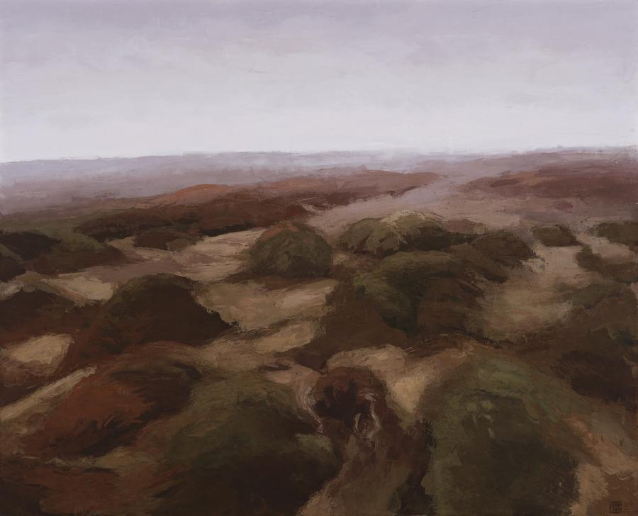 With its thickly applied mix of oil paint and bees wax, Vanishing Point No.6 has the subdued palette and diffuse light for which the painter's works are so keenly sought. The heath stretches out before us, meeting the dove-grey sky at an horizon line which dips and shifts as though subject to atmospheric pressure; the composition's vanishing point seemingly behind the hillock to our right.
