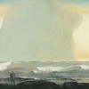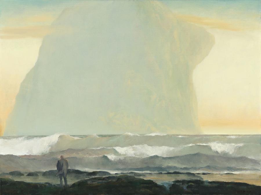 The sea has been an integral force in the paintings of Rick Amor since the 1980s when it began to emerge as both a metaphor for man's insignificance in the face of nature and as conduit of childhood memory and the past. The monumental The Rock and the Sea (National Gallery of Victoria, Melbourne) painted in 1990 began his series of works which feature the solitary figure on a pier or by the sea engulfed by a colossal looming rock form before them. Amor was drawn again to the subject in the early 90s with The Wave 1999 (private collection) and The Visitor 1999 (private collection). In the Wesfarmers example, Visitor by the Southern Seas 2000 the same solitary figure of a man stands in the foreground, blustered by the winds and gazing at the extraordinary rocky outcrop before him as though it is a sacred oracle.