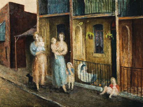 Herman painted old Sydney, then slums, with sympathy, a fresh eye and a lively mind.'Toanybody used to pictures of gum trees and the harbour,' he said,'my slum pictures werestartling. But I painted houses, because houses are part of people and people are part ofhouses.'1 These pictures are peopled with anecdote " a woman sweeps the front footpath,or stands in the doorway watching the passing parade, a child chases a dog, and othersplay in a vacant lot. The relaxed and casual continue in The Women of Paddington wheretwo young mothers chatting, hold babies in their arms, a small girl holds her mother'sskirt, a baby in a pram, and the eldest of the children sits wide-legged on the footpath. Forthose who lived in these small, often cramped terrace houses, the street offered the placeto socialize. In our painting the narrative continues in the detail of a black dog, a black catpeers inquisitively from a balcony, there are hanging baskets of flowers, and patternedtiles on the verandahs. Herman also involves the personalities of the houses themselves,as in the peeling paint. As Barry Pearce observed,'With a palette knife he plastered andscraped his pigments across the canvas so that the textures took on the very character ofthe buildings he was portraying.'2 The golden further glow enriches our painting. Throughpaintings such as these, where ideas, technique, and humanism harmonize, Sali Hermanhas long endeared himself to collectors.