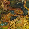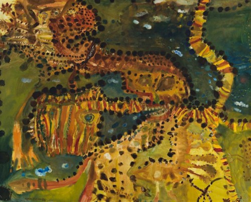 Olsen readily identified with the extraordinarily sensuous coastlines, sweeping bays, rolling surf and landforms. The busy seaports and blue deep waters of the Pacific were inherent with that raw energy and exuberance which distinguishes his earlier work. In each of these aerial views everything seems to be happening at once in an engaging chaos of calligraphy and inventiveness. As Deborah Hart observed in her masterly monograph on Olsen, 'His works now abounded in figurative imagery fused into a topography of human emotions and experience.'1 Spontaneity of handling allowed an easy interplay between figuration and abstraction, its infectious enthusiasm, colourfully and emotionally charged with the enjoyment of life. The sense of movement in All Around the Harbour is so striking that the voluptuous landforms seem to metamorphose into creatures of the sea. Baleful of eye, Octopus-like, their spotted tentacles are ready to snatch the viewer into the bosom of the painting. Through the presence of octopus and fish shapes in All Around the Harbour, Olsen adds gustatory delights to the many other pleasures that Sydney has to offer.