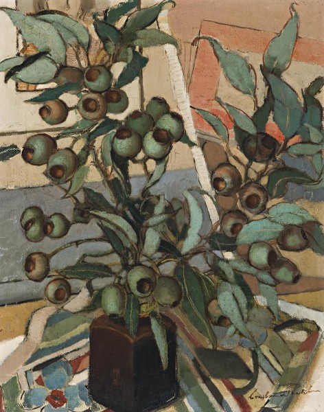 Green Gum Nuts c1933 was one of ten flower paintings among the fifty-two worksincluded in her 1933 Melbourne solo exhibition at the Decoration Gallery. Nevertheless, still life subjects are rare in her overall oeuvre. If that had not been so, she would long ago have challenged Margaret Preston's dominant position. Stokes was an outstanding still life painter, as seen in Green Gum Nuts. Ranking with the best that Preston then had to offer, its modernism and individuality has an appealing vitality and freshness of vision. While the eye is readily drawn to the sinuous greens of leaves and fullness of the nuts, their appeal is much enhanced by the colour contrast of the setting and its angled, geometric arrangements. This is further enriched by the skilful interplay between realism and abstraction. Stokes showed an early talent for still life when, in 1926, she won first prize for the genre while still a student at the Melbourne National Gallery Art School. Awarded the National Gallery of Victoria's Travelling Scholarship three years later, her paintings on return to Australia showed the beneficial influence of Walter Russell and William Monnington of London's Royal Academy schools. Modernist influences in Green Gum Nuts, however, reveal the benefits of having studied in Paris with André Lhote in the summer of 1933. Here, the gentlest hints of Cubism can be found in the structured balance and flatness of the setting, the perfect foil to the roundness of the gum nuts and striking three dimensionality of the brown vase. Within the conservative taste of Melbourne of the time, her 1933 exhibition was bold enough to evoke the comment that she had 'strayed from the Gallery training into that misty mid-region of the modernist'.2