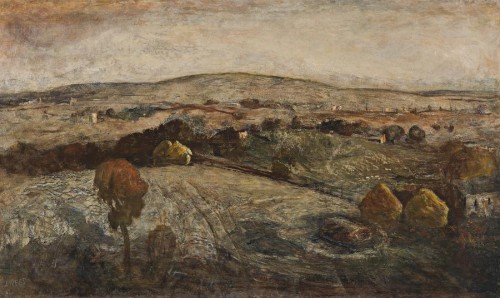 The light in Hills of Bathurst evokes the living past - of Australia's oldest inland settlement, where gold was first discovered, rich in beauty and memories. His first major painting of the area was the evocatively spellbinding Evening on the Bathurst Hills 1936 in the collection of the Art Gallery of New South Wales, Sydney. It is the soft evening light when nature enticingly attires herself in gentler robe as encroaching shadows tempt and tantalise. Over the following years he painted the Bathurst region at various times and seasons. Evening Landscape, Orange 1943, also in the Sydney Gallery's collection, suggests that it was painted from a spot near to the painting on offer.3 Related in time and mood, they share a breadth of sky, easy horizon line, and scattering of houses, all handled in a similar colour scheme. The scene must have appealed greatly to Rees for in 1944 he painted September Landscape, Orange. Even more like-minded to our painting, its season of rebirth and renewal is more pronounced through the enveloping golden light.4