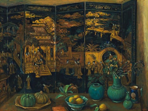 In Margaret Olley's masterful still life Chinese Screen and Yellow Room 1996 (Art Gallery of New South Wales, Sydney) it is as though the artist has taken a wide angle lens to her earlier version of the subject, Spanish Bottles and Chinese Screen painted around 1985. The same sprig of native wildflowers arranged in a green majolica gourd shape vase appears in each painting along with the magnificent oriental screen, although painted over ten years apart. In the Wesfarmers Olley we are drawn in closely to examine the richly carved and ebonised gilt Chinese screen and the love story that unfolds before our eyes and the lavishly glazed surfaces of the green majolica ware in the foreground. In both works there is a poised but seemingly accidental arrangement of the rusticated continental porcelain so popular in the nineteenth century and lovingly collected by Olley and abundantly displayed throughout her house. As her friend and follower Edmund Capon commented, 'Still-lifes and interiors are her métier, and Margaret Olley is a part of that tradition, from Vermeer in the seventeenth century to Morandi in the twentieth century - two of her most admired artists - which finds inspiration, beauty and a rich spirit of humanity in the most familiar of subject matter.'1 Spanish Bottles and Chinese Screen harks back to the French tradition of nature morte and probably references Vincent Van Gogh's Still Life: Majolica Jar with Wildflowers, 1888 (Barnes Foundation, Philadelphia), of which most certainly Olley would have known given her prodigious appetite for French art and her constant travels to museums and galleries throughout the world. In fact Spanish Bottles and Chinese Screen was painted shortly after several recovery trips to London, Majorca, Spain and Paris following the death of her close friend Sam Hughes and her mother. Olley also visited the United States in 1984 after touring the Bonnard Retrospective in Paris and it is possible she visited the Barnes Foundation and saw Van Gogh's famous Majolica Jar with wildflowers. The Wesfarmers Olley is replete with Majolica ware, in particular the Wedgewood 'greenware' including an Etruscan jug decorated with the Coquille St Jacques, as yet another reference to her beloved France.