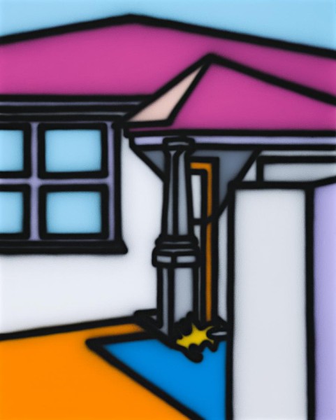 Howard Arkley intuitively found in the spray gun the perfect vessel to tell his story about suburban kitsch, domestic yearning and the delusional fantasy inherent in the replication and adaptation of architectural motifs and forms. Timothy Morrell comments that, 'the essential component of his approach to making art is the instrument he uses for painting, an airbrush that sprays the pigment onto the canvas, resulting in a mass produced appearance.'1 The vivid, implausible hues of his palette and the tell tale out of focus black outlines, hark back to the fetishism of custom painting and yet also heavily allude to graffiti and street art vandalism. Both streams take the everyday object and amplify and distort it thus elevating it to a cult like status. Through the airbrush Arkley's work thus vacillates between what Clement Greenberg referred to as avantgarde and kitsch. It is high art but its subject matter firmly resides in the suburban world of Dame Edna Everage and the Australian film classic, The Castle. Colour Field Home, 1999 explores this juncture brilliantly.