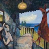 This personification of place is a consistent thread through both Kangaroo and Shead's D.H. Lawrence paintings. Both painter and writer shared an affinity for the landscape as a mystical and alive place, the ocean a force which occurs as a theme of purification in both paintings and novel. Glimpsed from the side of the bungalow, the Pacific rises to the horizon, the burnt yellow grass of late summer covering the headland. In the final chapter of Kangaroo, the landscape eclipses the characters of Richard and Harriet as the subject of the novel, and so too in the D.H. Lawrence paintings. Beyond the scenes of human endeavour played out in the half-dark of the bungalow rooms, the coastal landscape floods in through the windows and balconies.