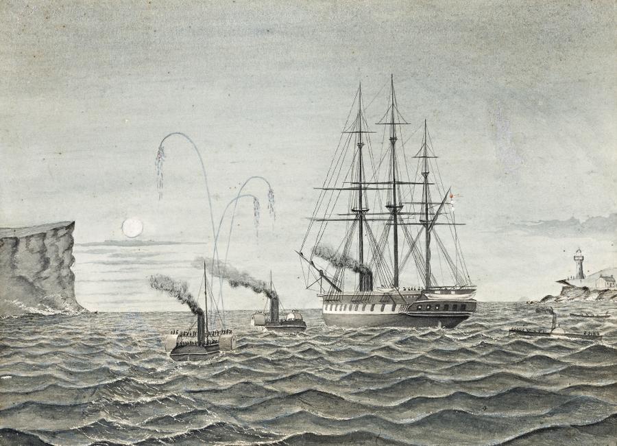 Australian School HMS GALATEA PASSING THE SYDNEY HEADS WITH THE PELICAN AND EMU IN ATTENDANCE, c.1868