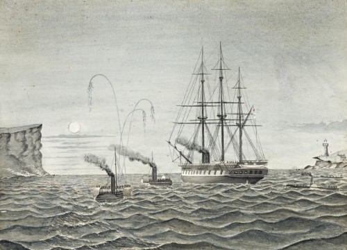 HMS GALATEA PASSING THE SYDNEY HEADS WITH THE PELICAN AND EMU IN ATTENDANCE, c.1868