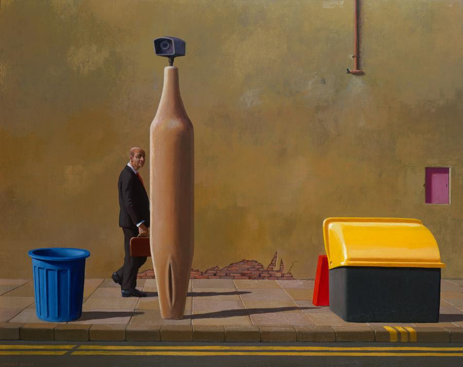 Smart has often said that the figures in his paintings are there to give scale. Mr Eugenides is too significant for that, embodying, as he does for Eliot the depersonalization of human beings in the soulless modern business world, echoed by Smart.1 In Eliot the person of Tiresias follows hard on that of Eugenides. Again Smart follows suit. Tiresias, the celebrated mythological prophet of ancient Thebes, had been changed into a female and back again. As a result of his famous judgement that the female received ten times the greater pleasure in making love, he lost his eyesight courtesy of Juno and gained the gift of prophecy and long life via Jupiter. Eliot called Tiresias 'the most important personage in the poem', adding that 'the two sexes meet' in him.2 For Smart he is the strange hermaphroditic traffic counter with the all-seeing eye atop. While Smart in his autobiography Not Quite Straight reveals his role, he may also claim the role of oracle in modern times through the metaphor of the security camera. The autobiographical continues in the render missing from the wall, outlining the coast of South Australia.3 Of Eliot and Smart, Peter Quartermaine has written, 'He has said that what attracts him to Eliot's characters - Sweeney, Prufrock, Mr Eugenides - is that they are "fascinating, and ordinary with it". His own creation, the middle-aged, dark-suited figure who sometimes (in a nod to Eliot) appears as "Mr T.S. Eugenides", is an exercise on this theme. His familiar presence in Smart's urban landscapes reminds us that this is our world... .'4 Shaftesbury Avenue runs through London's Soho, the street kerb revealing yellow lines of no standing. It is starkly empty. Mr T.S. Eugenides, Morning, Shaftesbury Avenue, like Eliot's The Waste Land, is a dramatic monologue, at times opaque and others revealing.