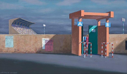 Jeffrey Smart's mastery of expectancy is so effective that, in Second Study for Stadium Entrance, the excitement generated before the big game is palpable. It is made even more so by the placement of the spectator/viewer outside the stadium, eager to enter. There is that hush before the start, those same emotions that Smart generates so well in other paintings as darkening skies foretell a coming storm of Wagnerian might - which never arrives. Again, it is like being at the opera waiting for the curtains to rise to reveal a dimension beyond reality. Compositionally perfect, as always, all Smart's forms and colours conspire and aspire towards realization of the ideal, which, being beyond human endeavour, we must wait upon, as does the expectant sports fan and theatre goer.Paradoxically, the ever-enigmatic Smart is the ever-objective observer - coolly viewing the stadium where so much passion will soon be spilt. Smart, however, cleverly introduces another tension, that pull between anonymity - figures are seen only in part through the partially opened gate - and passion, as the starkly profiled grandstand takes on a menacing feel, reaching claw like into the sky. In the catalogue essay to the 1999 exhibition in which this painting was shown, Bruce Beresford perceptively observed, 'People depicted in the paintings often seem overwhelmed or bewildered by their surroundings and there appeared to be a hidden narrative that made them all the more tantalising.'1 Shadows, as always, are a fundamental part of the composition and heightened mood.