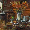 Spanish Jug and Kelim evokes a great sense of intimacy as though we are observing a private moment in time. The female figure floating in the shadowy background arranges a laid table, perhaps in readiness for another painting, oblivious to our gaze. The scene has a similar sensibility as Edouard Vuillard's domestic interior paintings, with their ambiguous source of light, lush textiles and decorative arts littering the compositions. Olley travelled extensively with her artistic milieu and brought home many aides-memoire of her journeys and indeed she had travelled to Spain and Majorca on several occasions. Thus rustic Spanish ceramic ware often found a prominent place in her works. On a trip to Asia in 1983 she was accompanied by tribal rug expert Geoff Kitto and the artist botanical artist Paul Jones. Following this trip, Kelim rugs and rich tapestries would regularly feature in her paintings and a new lavishness was found in her interior scenes such as The Chinese Screen and Yellow Room, 1996 now in the Art Gallery of New South Wales.