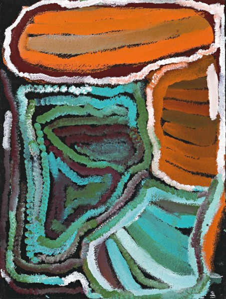 This work is accompanied by a certificate of authenticity from Short Street Gallery, which states: 'Kirriwirri is in the Great Sandy Desert close to and west of Well 33 on the Canning Stock Route. It is the birth place of Jan and her family. This work shows tali (sand dunes) and jila (living water).'